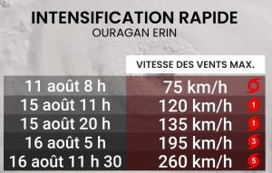 L’ouragan Erin s’est rapidement intensifié pour atteindre la catégorie 5, une catégorie rare, avec des vents soutenus atteignant160 mph, et devrait encore gagner en puissance. Le directeur du Centre national des ouragans a déclaré lors d’un point presse que cette tempête extrêmement puissante s’était intensifiée de manière explosive pendant la nuit. Erin se trouve actuellement dans les Caraïbes et devrait passer au nord des îles Vierges et de Porto Rico ce week-end, apportant jusqu’à 15 cm de pluie, avec un risque d’inondations soudaines et de glissements de terrain.
