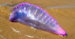 Par Michel Séguin : La caravelle portugaise (Physalia physalis) mieux connue sous le nom de man-of-war en Floride est un hydrozoaire marin flottant que l’on trouve dans l’océan Atlantique qui dérive au gré du vent et des vagues, et qui est très résistant si on la touche. Bien qu’il ressemble superficiellement à une méduse, la caravelle portugaise est un siphonophore. Or si vous voyez la créature sur la plage, ne la touchez pas ! Même si elle est morte. La caravelle portugaise peut piquer même plusieurs jours après sa mort. Même s’il est tentant de la toucher vous risquez de vous faire piquer. Que se passe-t-il si vous êtes piqué ? La caravelle portugaise est capable d’infliger une piqûre atroce, mais il est rarement mortel pour l’homme. La plupart des personnes souffrent d’une douleur immédiate qui dure jusqu’à 20 minutes. Dans les cas les plus graves, la piqûre peut provoquer des douleurs thoraciques et des difficultés respiratoires. Après la piqûre, les tentacules laissent de longues marques rouges et filandreuses sur la peau.