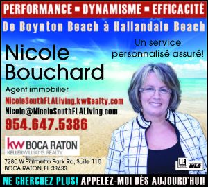 D’autre part, certains propriétaires de condo, qui estiment trop contraignantes les consignes sanitaires ou qui préfèrent plus d’intimité et moins de risques de contracter la COVID-19, se tournent vers l’achat d’une maison avec piscine, mesure qui limite les contacts avec un trop grand nombre de personnes. Nicole Bouchard évolue au sein de la firme de courtage Keller Williams Realty de Boca Raton. « Cette entreprise, fait remarquer Nicole Bouchard, est numéro un dans son domaine aux États-Unis et est présente dans plus de 32 pays. La formation, la technologie et l’information comptent parmi les priorités de cette firme de courtage. Nous sommes donc bien appuyés et en mesure de pouvoir conseiller nos clients selon leurs besoins et les guider dans leurs transactions. » Pour Nicole Bouchard quel que soit le montant d’une transaction, le vendeur et l’acheteur méritent d’être bien servis. L’agente travaille principalement dans les comtés de Broward et Palm Beach.
